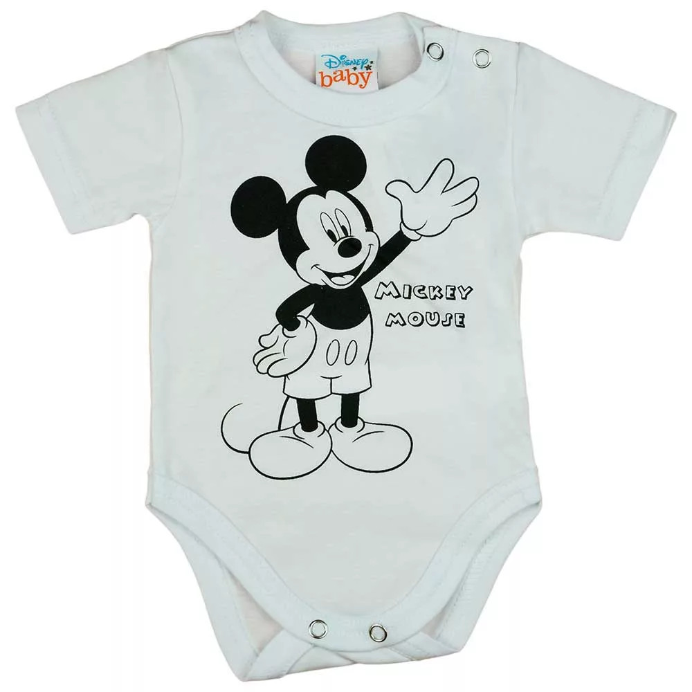Kisbabák ruhatárának alapdarabja a baba body. Vékony, bababarát, 100 % pamut anyagból készült. Elején kedves Mickey egér mintával. Vállán patentos, ami megkönnyíti a baba öltöztetését. Lába közötti patentos megoldás, pedig a gyors peluscserét teszi lehetővé.