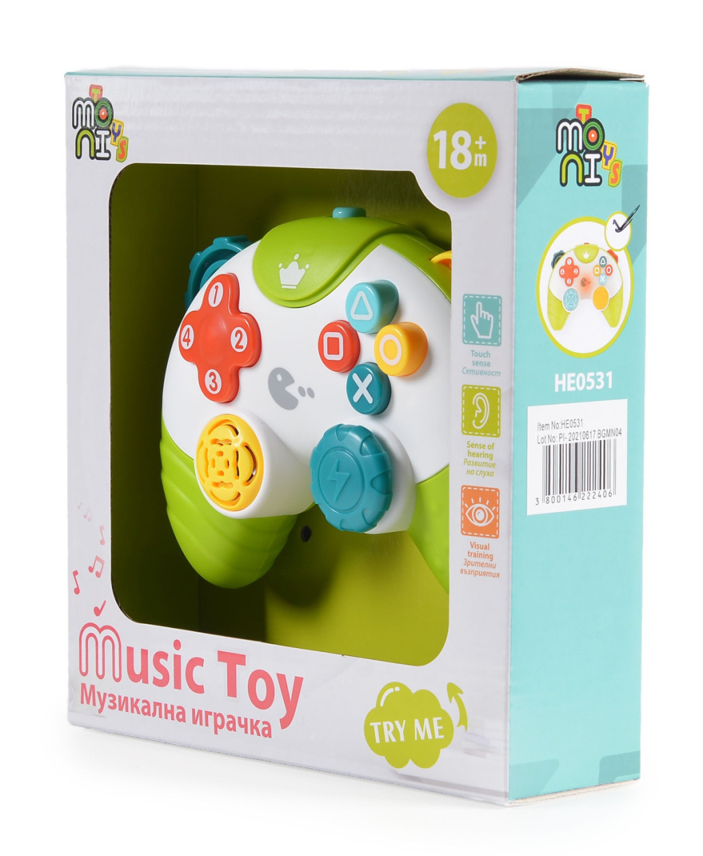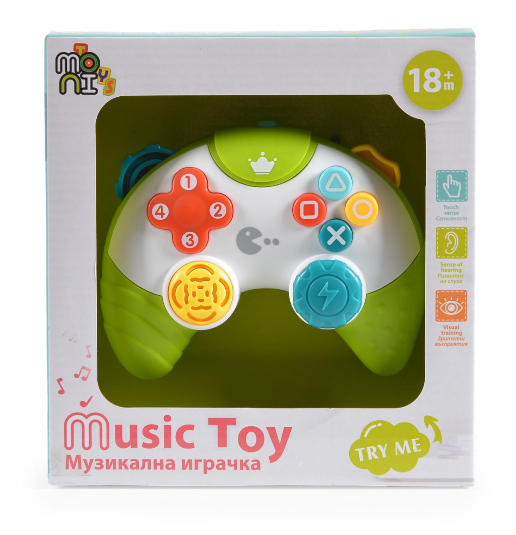 A zenélő joystick segít a gyerekek hallási, érintési és látási fejlődésében, 18 hónapos kortól ajánlott a játék.