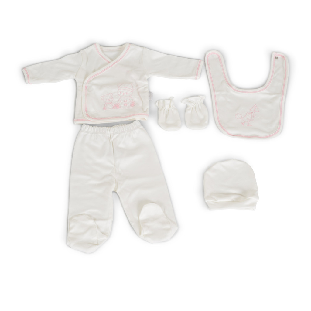 Az 5 darabos babakelengye készlet teljes egészében 100% pamutból készült.