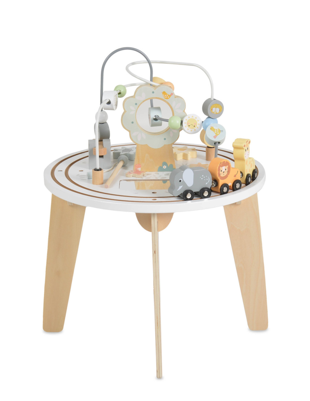 Ébressze fel gyermeke kíváncsiságát és fejlessze képességeit ezzel a több játékterülettel rendelkező Moni Toys fa játékasztallal!