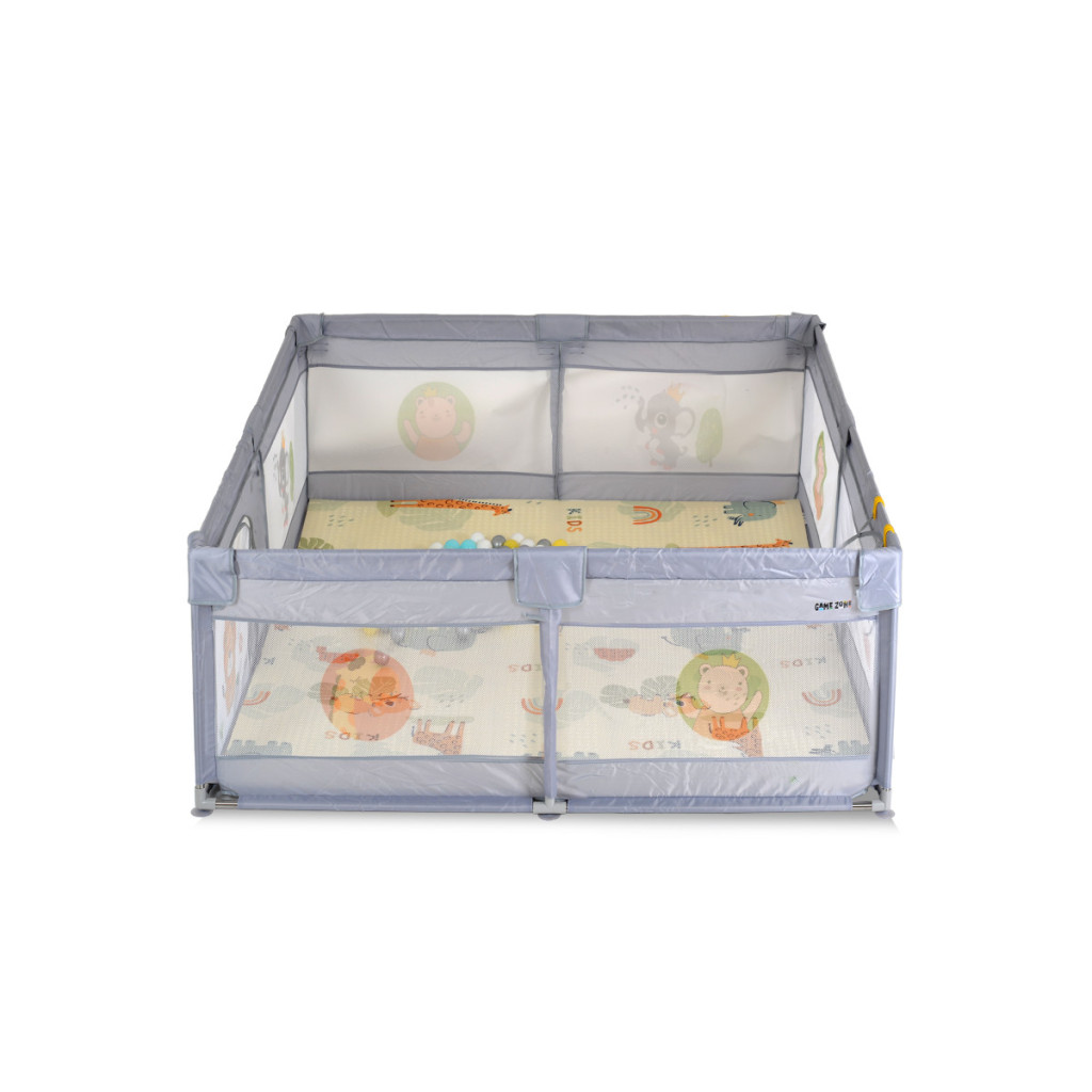 Moni Game Zone összecsukható járóka szőnyeggel, 60 labdával 120x120cm - Szürke