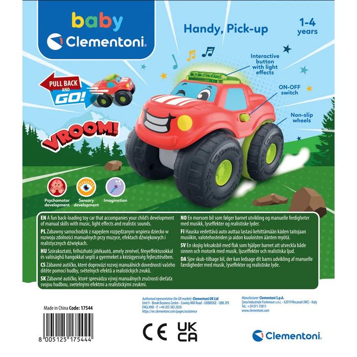 A Clementoni Handy hátrahúzós baby pick-up autó hanggal és fénnyel egy vidám, interaktív játék, amely tökéletes választás a legkisebb autórajongók számára. Az 1-4 éves gyerekeknek készült jármű nem csupán aranyos megjelenésével, hanem izgalmas funkcióival is lenyűgözi a piciket. A hátrahúzós mechanizmusnak köszönhetően elég csak hátrahúzni az autót, majd elengedni, és Handy máris lendületesen elindul – ezzel serkentve a mozgást és a kíváncsiságot.