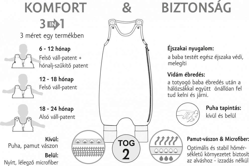 -Fazon: 3 méret-tartományban használható, állítható bélelt hímzett totyogó hálózsák, oldalt záródó cipzárral, lábfején visszahajtható passzéval.