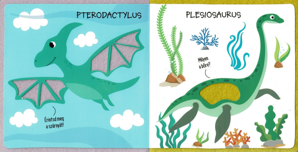 Ez alapozó egy olyan könyv, amely egyszerre nyújt élményt és fejlesztési lehetőséget a legkisebbek számára. Segítségével a gyerekek játékosan ismerkedhetnek meg a dinoszauruszok világával, miközben fejlődnek az érzékszerveik és motoros készségeik.