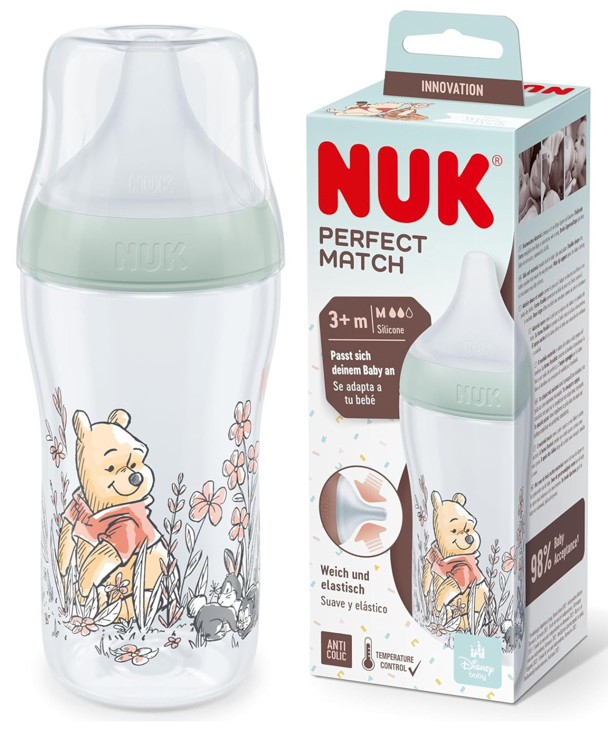A NUK Perfect Match cumisüveg hőmérséklet-szabályozással és puha szilikon cumival. A speciális forma, amely a NUK cumiknál megszokott, ortodontikus, anti-kólikás cumival van ellátva, amely az anyatejes szoptatásnál az anyai mellbimbó formáját követi. Megfelelő teret biztosít a nyelv és az állkapocs természetes szívómozgásaihoz. Az ivás közbeni nagy, széles ajaktámasz az anyai bőrre emlékeztet. A cumisüveg úgy van kialakítva, hogy a baba ne érintkezzen kemény műanyag részekkel. A továbbfejlesztett Anti Colic Air System biztosítja a tej természetes áramlását, hogy a baba nyugodtan ihasson, levegőnyelés nélkül. Sima, enyhén szűkülő forma anti-kólikás funkcióval a zökkenőmentes folyadékáramlás érdekében, 3 hónaptól anyatej). A cumisüvegek most már új NUK hőmérséklet-ellenőrző jelzővel vannak ellátva, amely segít megakadályozni, hogy a baba túl forró ételt igyon. A jelző úgy néz ki, mint egy hőmérő, a mércézés között helyezkedik el, és a cumisüveg tartalmának hőmérséklete megváltoztatja a színét. Ha az étel túl forró, a kék jelző fehérre vált. Ideális esetben az ételnek testhőmérsékletűnek kell lennie (37°C), ami a kijelző kék színének felel meg. Kiváló minőségű törhetetlen polipropilén műanyagból készült, és nem tartalmaz BPA-t (Biszfenol A). A cumisüveg 260 ml űrtartalmú.  M 3 hónaptól méretben anyatejhez). Klinikailag tesztelt.