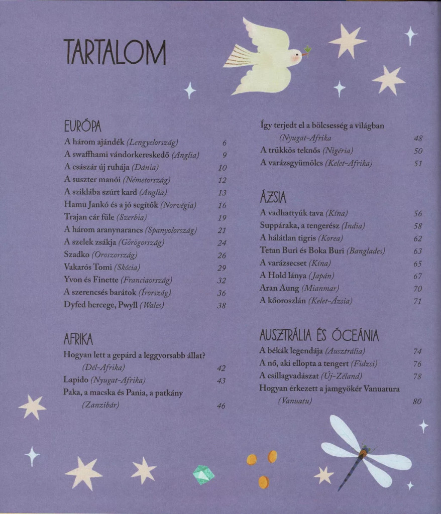 Rövidebb és hosszabb történetek egyaránt helyet kaptak benne, így bármelyik naphoz, bármilyen hangulathoz található benne megfelelő mese. A történetekben állatok, királylányok, varázslók, barátságok és álmok szerepelnek – minden, amit egy kisgyermek szerethet.