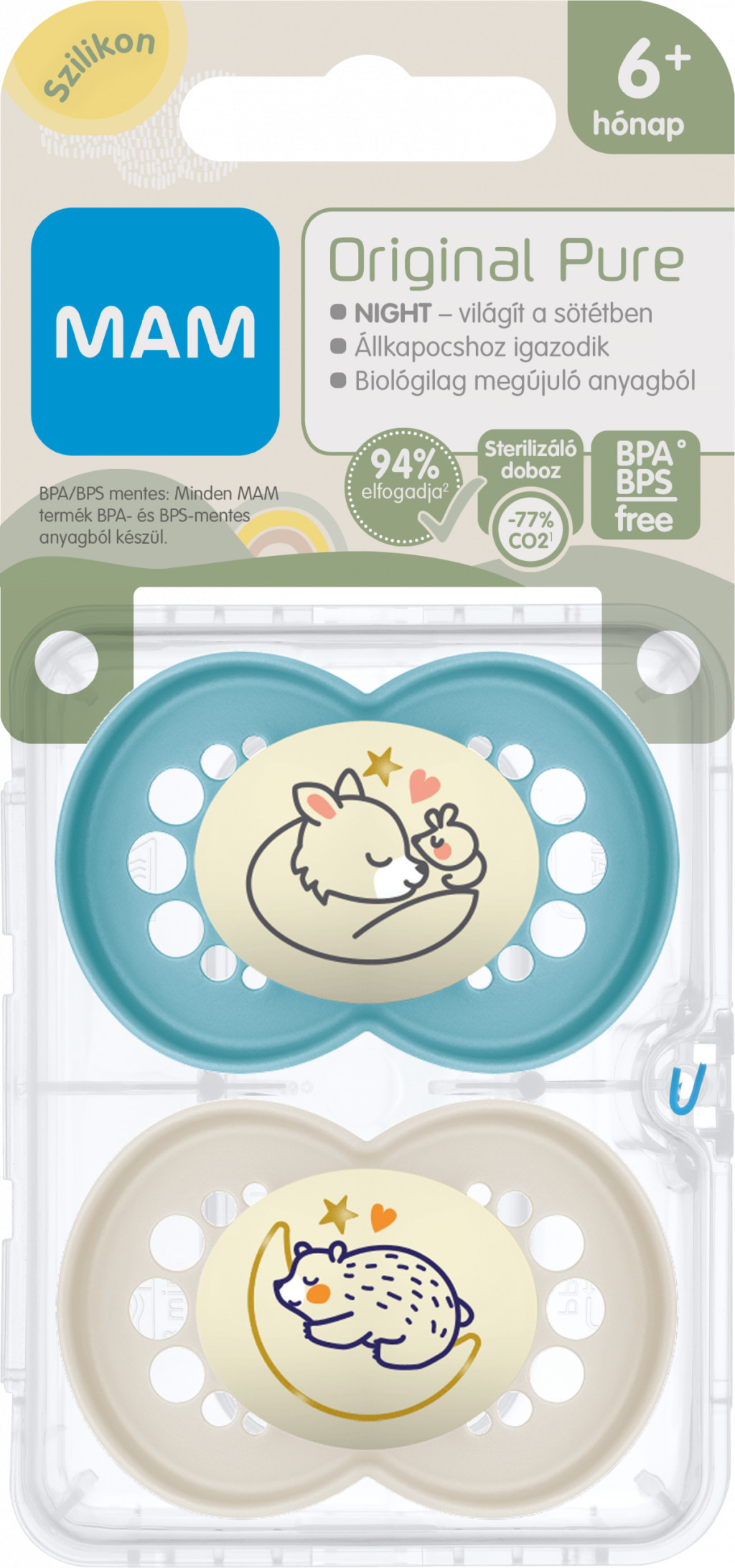 MAM Original Pure Night 6+ hó nyugtató cumi 2 db-os  - türkiz egér/bézs medve