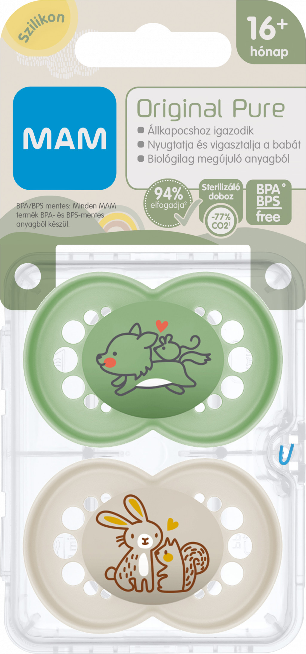 MAM Original Pure 16+ hó nyugtató cumi 2 db-os - zöld farkas/bézs nyuszi