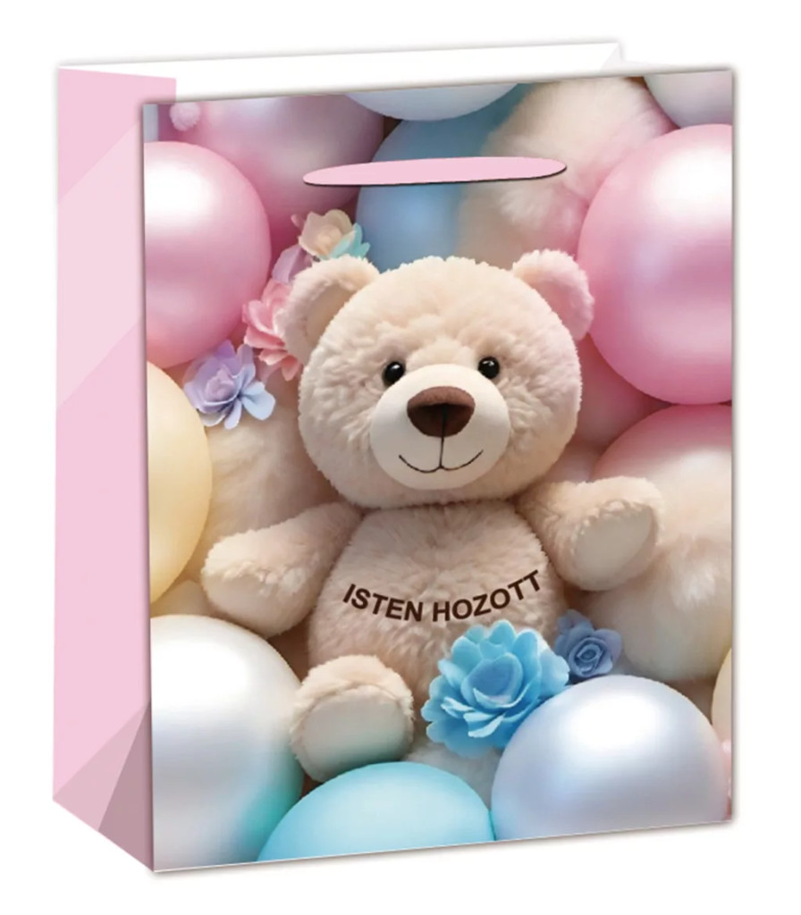 Ajándéktasak Plüss Maci lufik között, ISTEN HOZOTT felirattal 26x32 cm