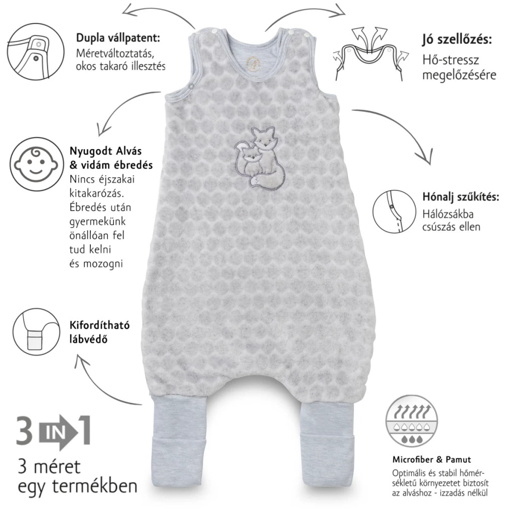 Fazon: 3 méret-tartományban használható, állítható bélelt hímzett totyogó hálózsák, oldalt záródó cipzárral, lábfején visszahajtható passzéval