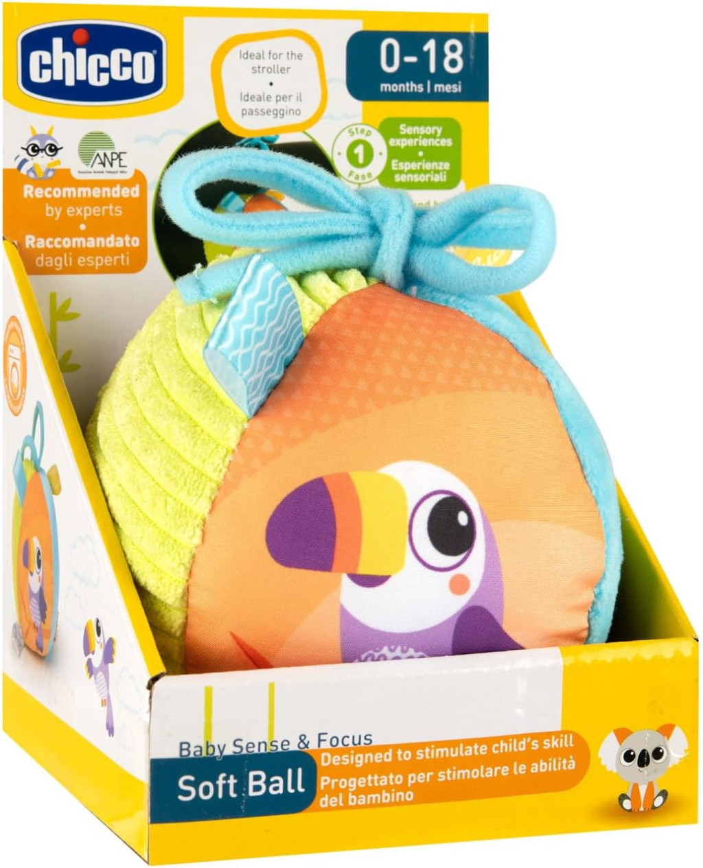Babakocsira ideális játék. Puha labda különféle kiváló minőségű anyagokból: könnyű és könnyen megfogható.
