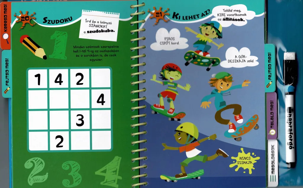 A mellékelt letörölhető toll miatt a füzet sokszor használható: a megoldások finomíthatók, a hibák nyomtalanul eltüntethetők, a kedvenc oldalak pedig bármikor újrajátszhatók. Ez különösen hasznos a szünidő hullámzó figyelmében: a gyerekek anélkül gyakorolnak, hogy „feladatnak” éreznék, és észrevétlenül fejlődik a kitartásuk, rutinjuk és a problémamegoldó gondolkodásuk.