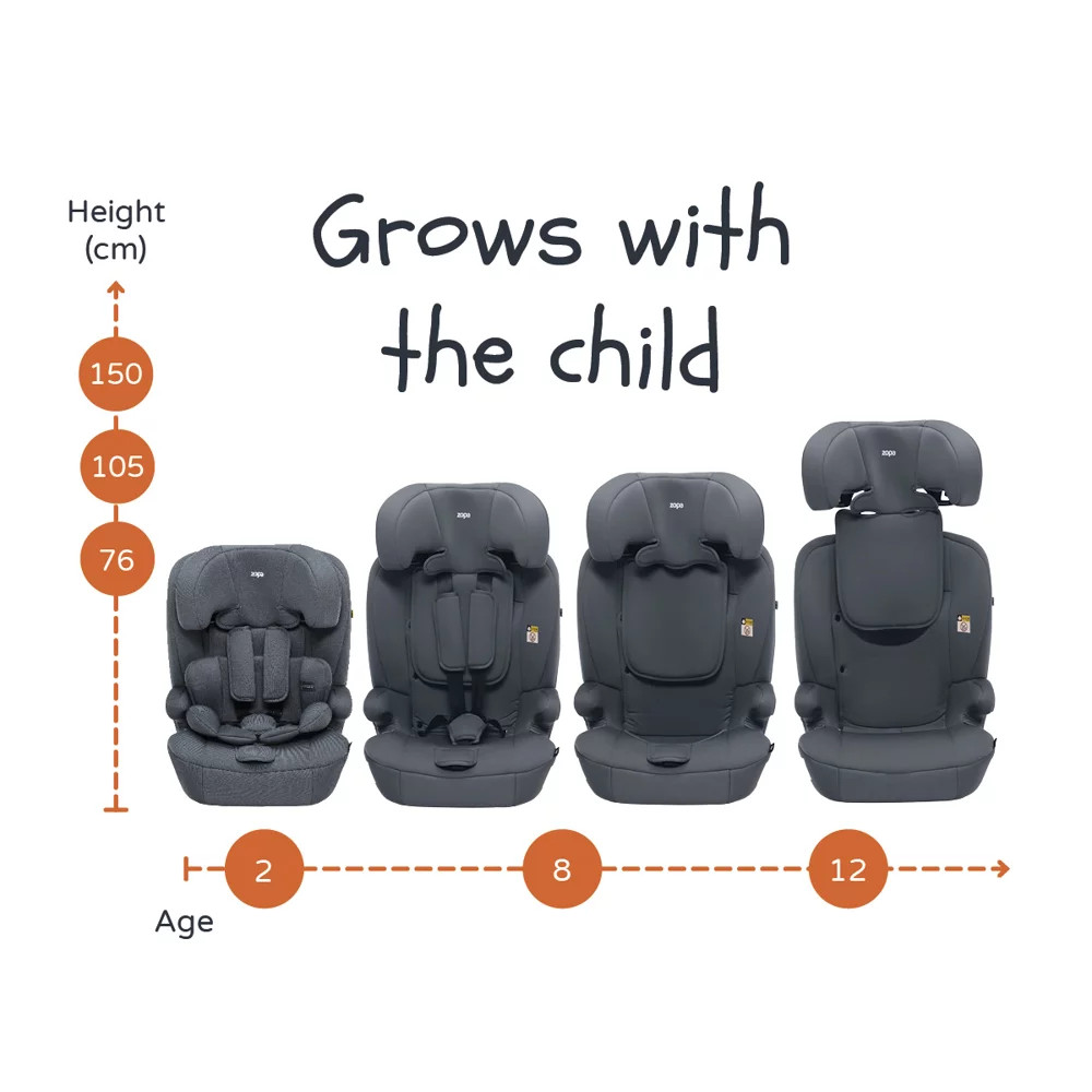 A Zopa Alfa R129 megbízható autósülés, amely körülbelül 15 hónapos kortól egészen 12 éves korig elkíséri gyermekét. Megfelel a szigorú ECE R129 (i-Size) biztonsági szabványnak, és 76-150 cm testmagasságú gyerekek számára készült.