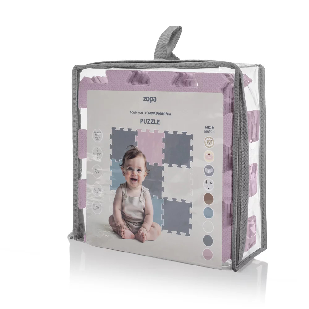 Az egyes 30 × 30 cm-es lapok (9 db) tökéletesen illeszkednek egymáshoz. Az alátét születéstől kezdve alkalmas gyermekek számára, ártalmatlan és kellemes anyagból készült.
