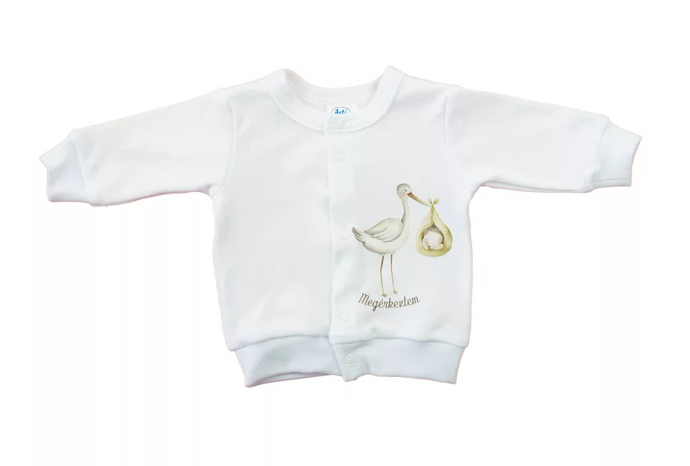 Továbbá egy elöl patentos kocsikabátot is találunk a szettben, melyen szintén a vidám gólyás minta kapott helyet.