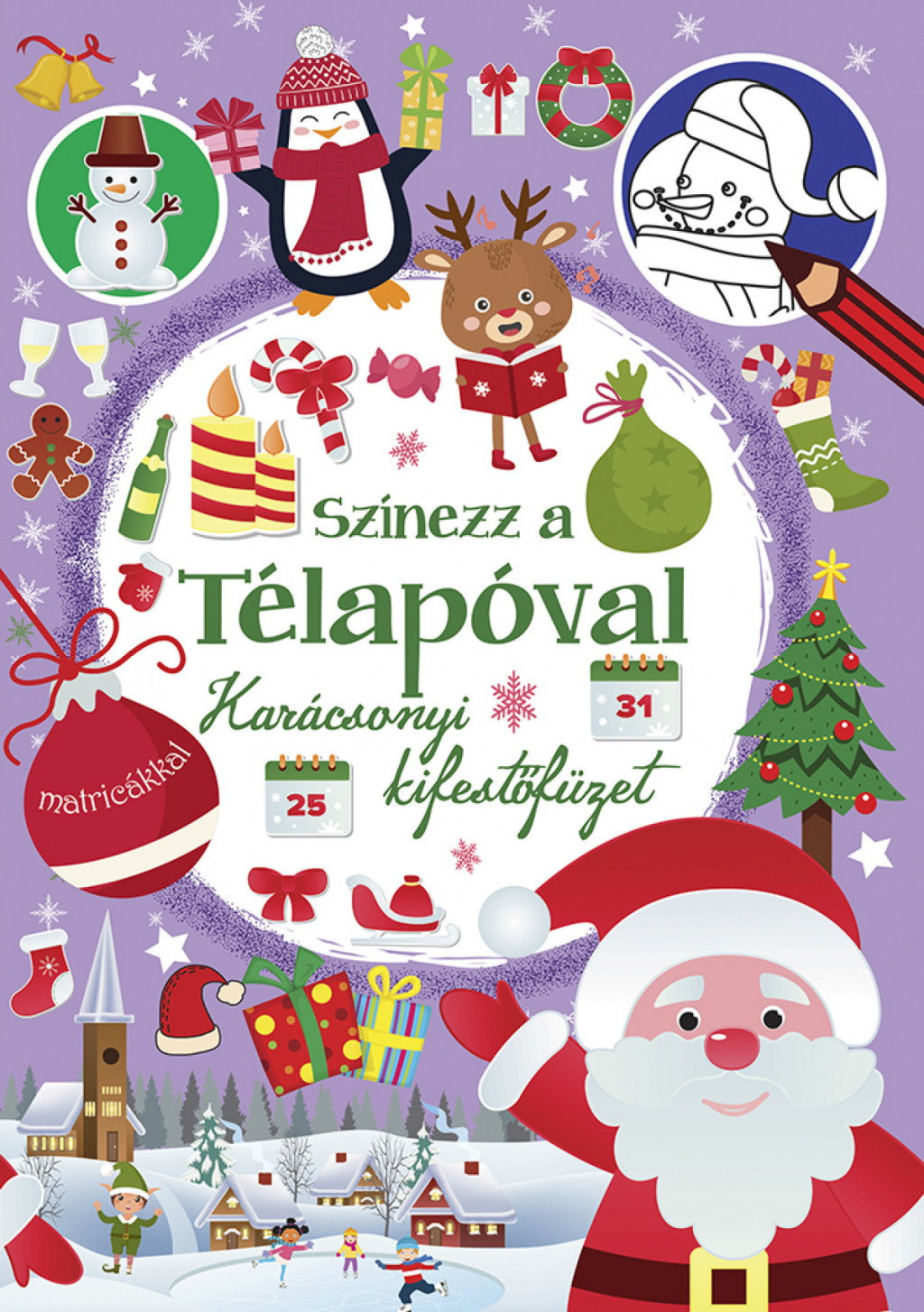 Kifestőfüzet tele karácsonyi témájú rajzokkal: télapóval, hóemberrel, gyerekekkel, karácsonyfával.