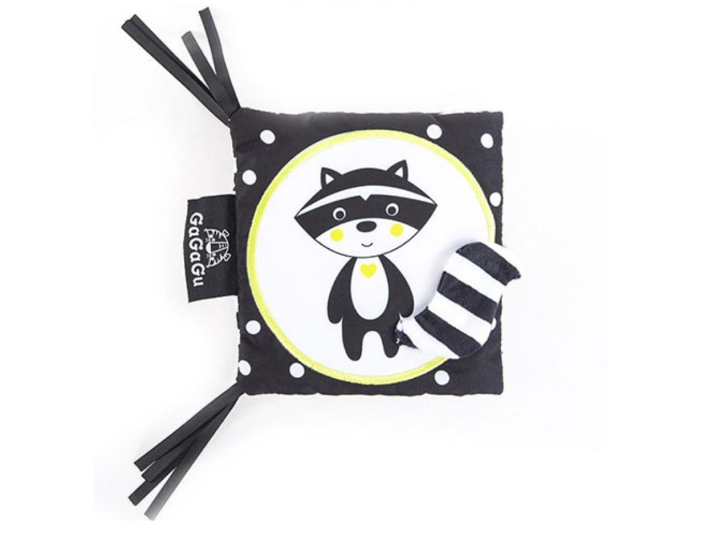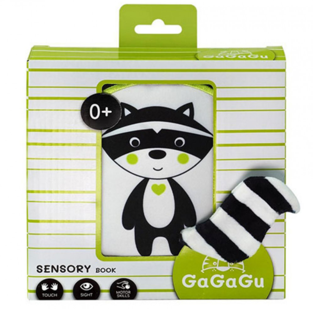 A GaGaGu könyvecske kontrasztos színű és mintázatú, ami serkenti a csecsemő látását. Az egyik oldalon az állatok kontrasztos, hímzett elemekkel kiegészített illusztrációi találhatók, amelyek érezhetően más textúrájúak a gyermek számára az ujjai alatt, ami stimulálja a tapintás érzékelését, a különféle textúrák megismerését a gyermek számára. A másik oldalon kerek plüss fedelek találhatók, amelyek lehetővé teszik a csecsemő egyik kedvenc kukucs! játék játszását. Minden fedél mindkét oldalán más-más minta van – egy elem, de két teljesen eltérő vizuális élmény. Az állatok képét tartalmazó fedelek alatt az élelem szimbólumai találhatók, amelyet az adott állat eszik + a plüss fedelekbe susogó anyag van varrva, amely kinyitásukkor és megérintésükkor susog – így a fiatalabb gyermek megismeri a különböző alakokat és színeket, valamint hallás-serkentésben van része, az idősebb gyermek pedig megtanulja, milyen élelmet fogyaszt az adott állat. A játék nagyon könnyű és kézreálló, könnyen tárolható, ideális arra, hogy magunkkal vigyük egy sétára vagy utazásra. Nem tartalmaz műanyag elemeket, szalagok segítségével rögzíthető a kiságyhoz vagy babakocsihoz.
