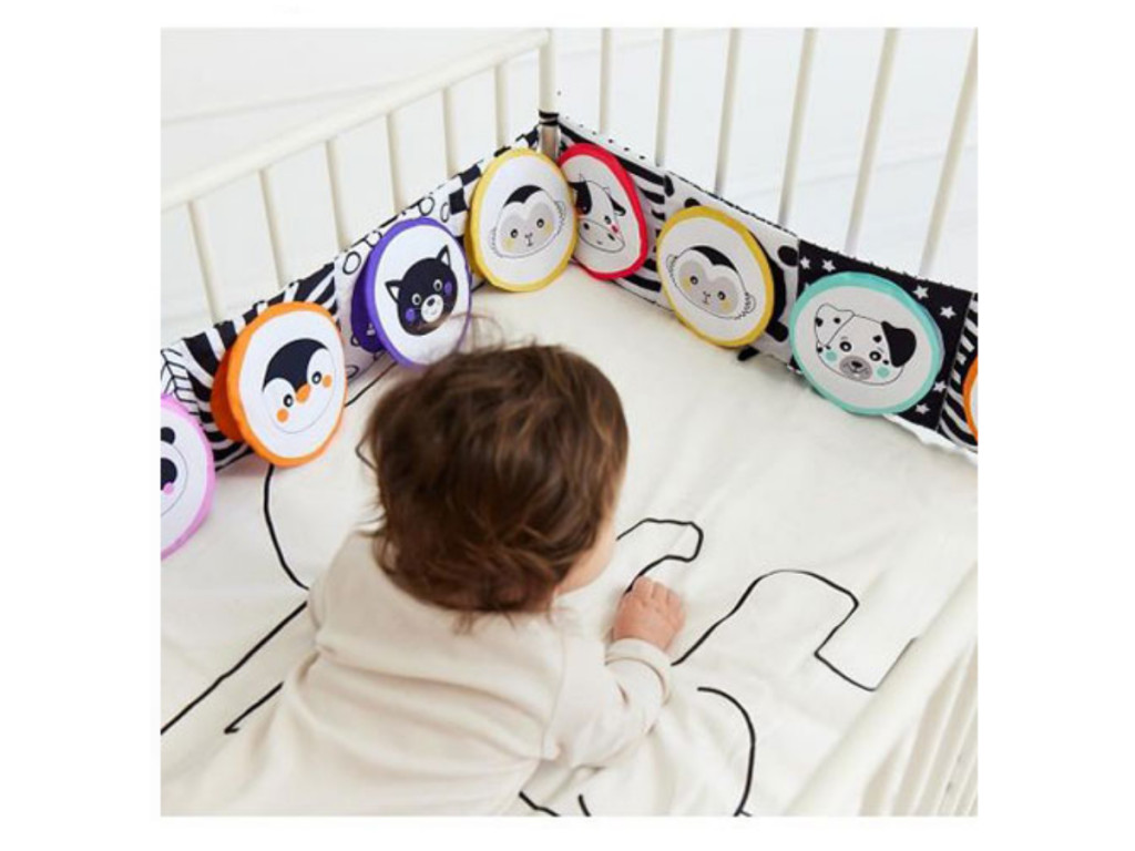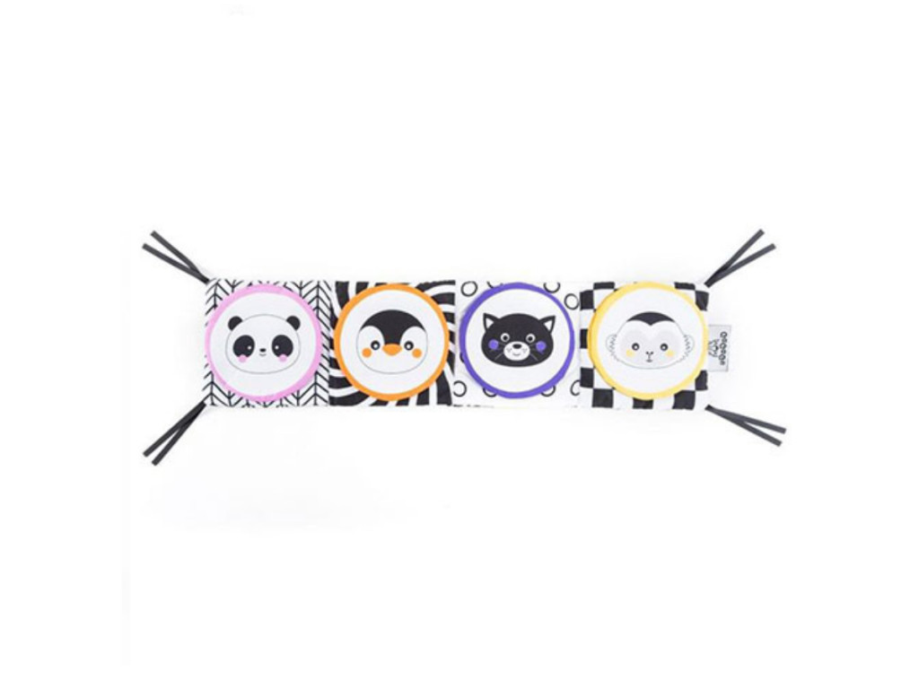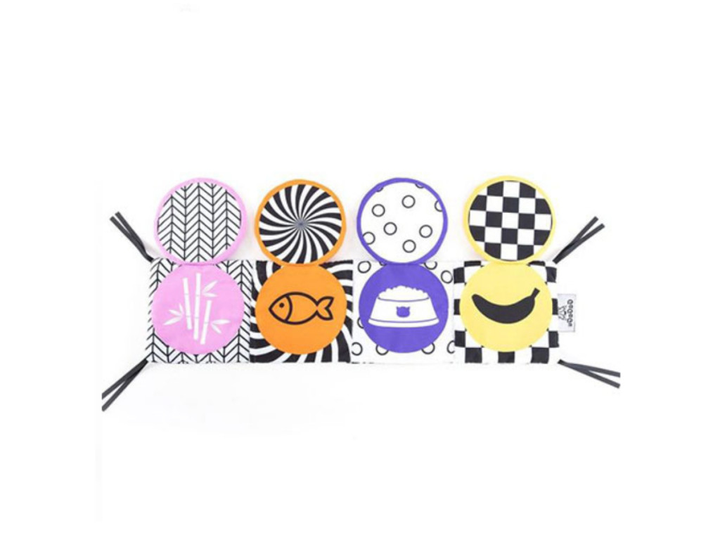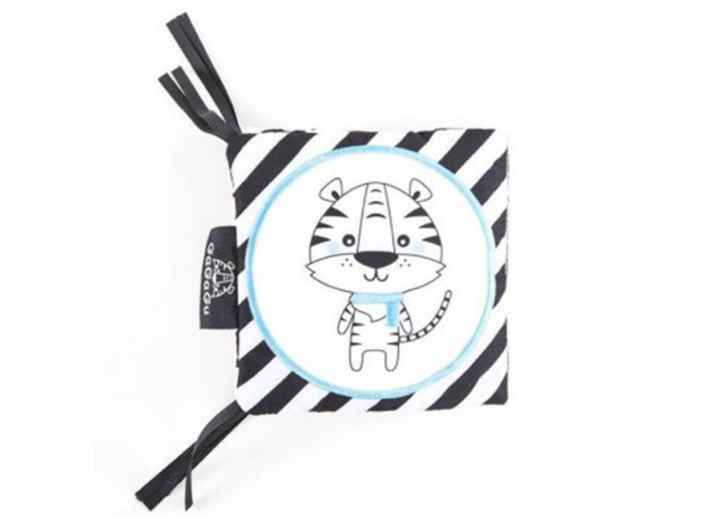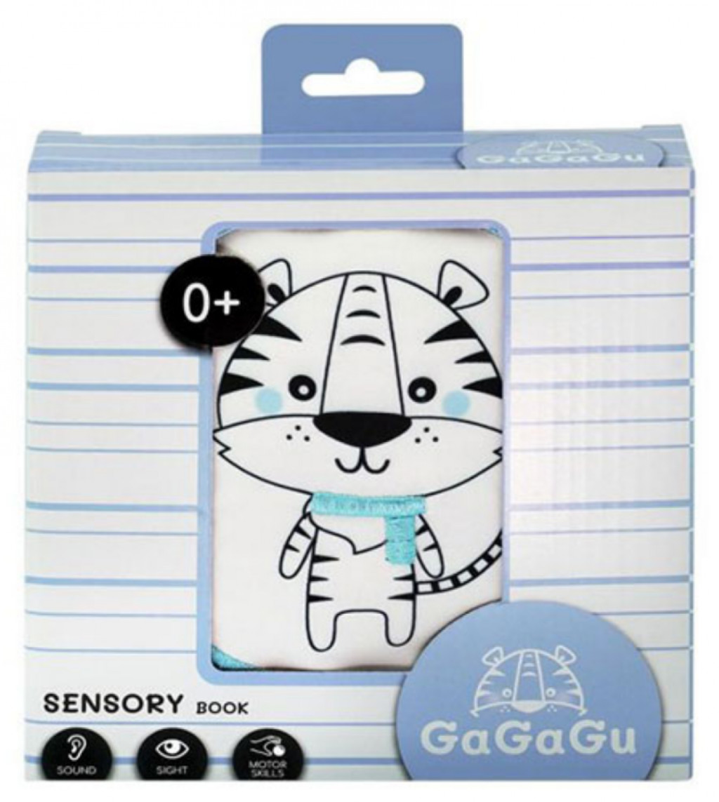 A GaGaGu könyvecske kontrasztos színű és mintázatú, ami serkenti a csecsemő látását. Az egyik oldalon az állatok kontrasztos, hímzett elemekkel kiegészített illusztrációi találhatók, amelyek érezhetően más textúrájúak a gyermek számára az ujjai alatt, ami stimulálja a tapintás érzékelését, a különféle textúrák megismerését a gyermek számára. A másik oldalon kerek plüss fedelek találhatók, amelyek lehetővé teszik a csecsemő egyik kedvenc kukucs! játék játszását. Minden fedél mindkét oldalán más-más minta van – egy elem, de két teljesen eltérő vizuális élmény. Az állatok képét tartalmazó fedelek alatt az élelem szimbólumai találhatók, amelyet az adott állat eszik + a plüss fedelekbe susogó anyag van varrva, amely kinyitásukkor és megérintésükkor susog – így a fiatalabb gyermek megismeri a különböző alakokat és színeket, valamint hallás-serkentésben van része, az idősebb gyermek pedig megtanulja, milyen élelmet fogyaszt az adott állat. A játék nagyon könnyű és kézreálló, könnyen tárolható, ideális arra, hogy magunkkal vigyük egy sétára vagy utazásra. Nem tartalmaz műanyag elemeket, szalagok segítségével rögzíthető a kiságyhoz vagy babakocsihoz.