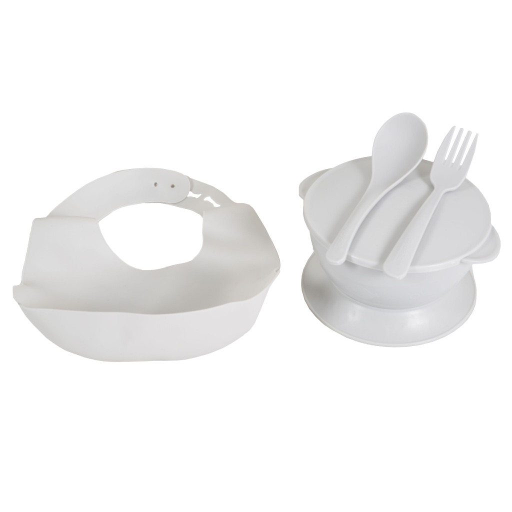 - Szilikon előke, tál fedővel és csúszásmentes talppal, kanál és villa - minden, ami az első önálló falatozáshoz szükséges.