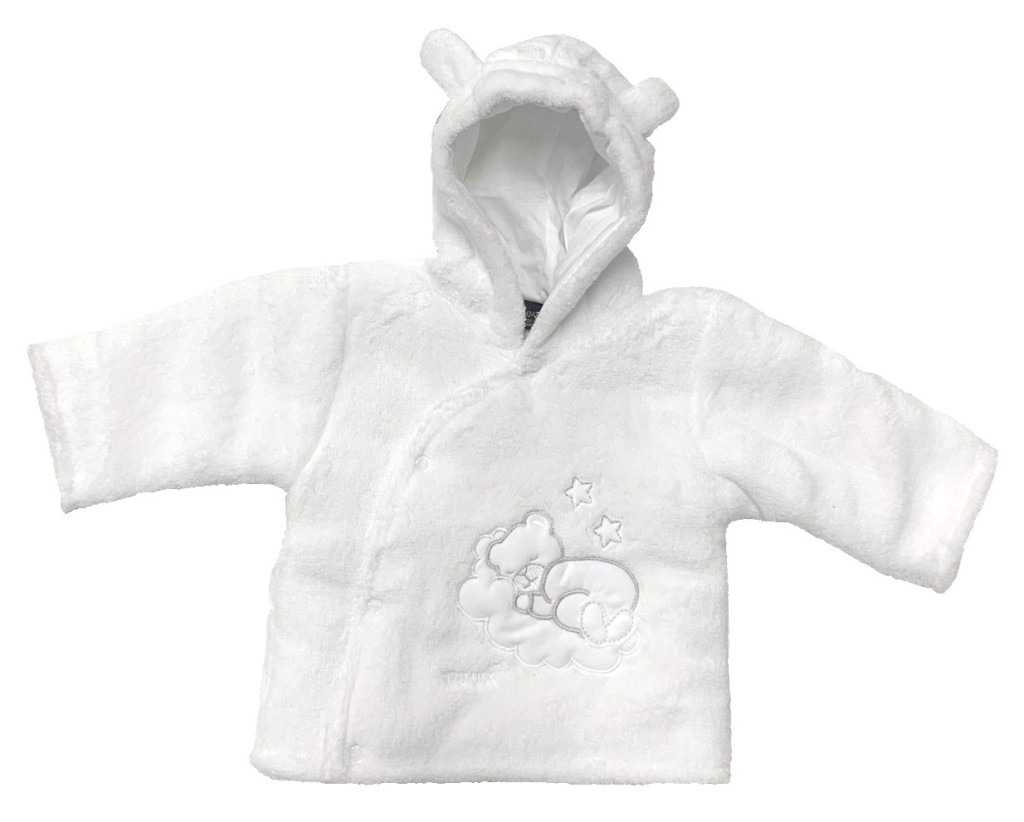 Bélelt kabát hímzéssel, macifüles kapucnival, elöl ivesen, patenttal záródik.